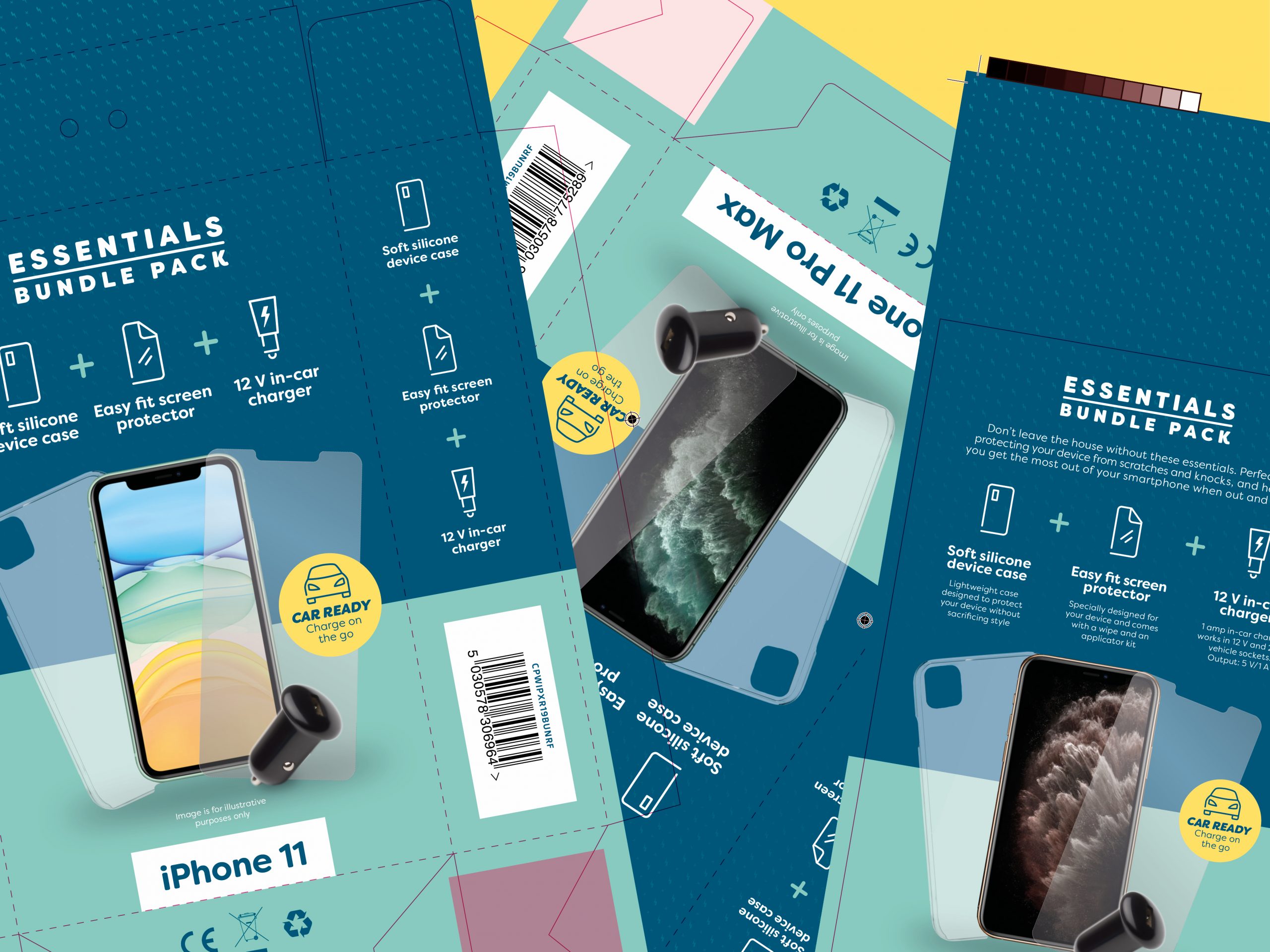 An exclusive smartphone accessories pack created for Carphone Warehouse. Must-have accessories including a car charger, screen protector and protective case were bundled into each pack and over 35 combinations were produced for nearly every smartphone available on the UK market in 2018/2019. A successful pitch led to listings in all Carphone Warehouse stores across the UK with an outstanding sales performance throughout its cycle.