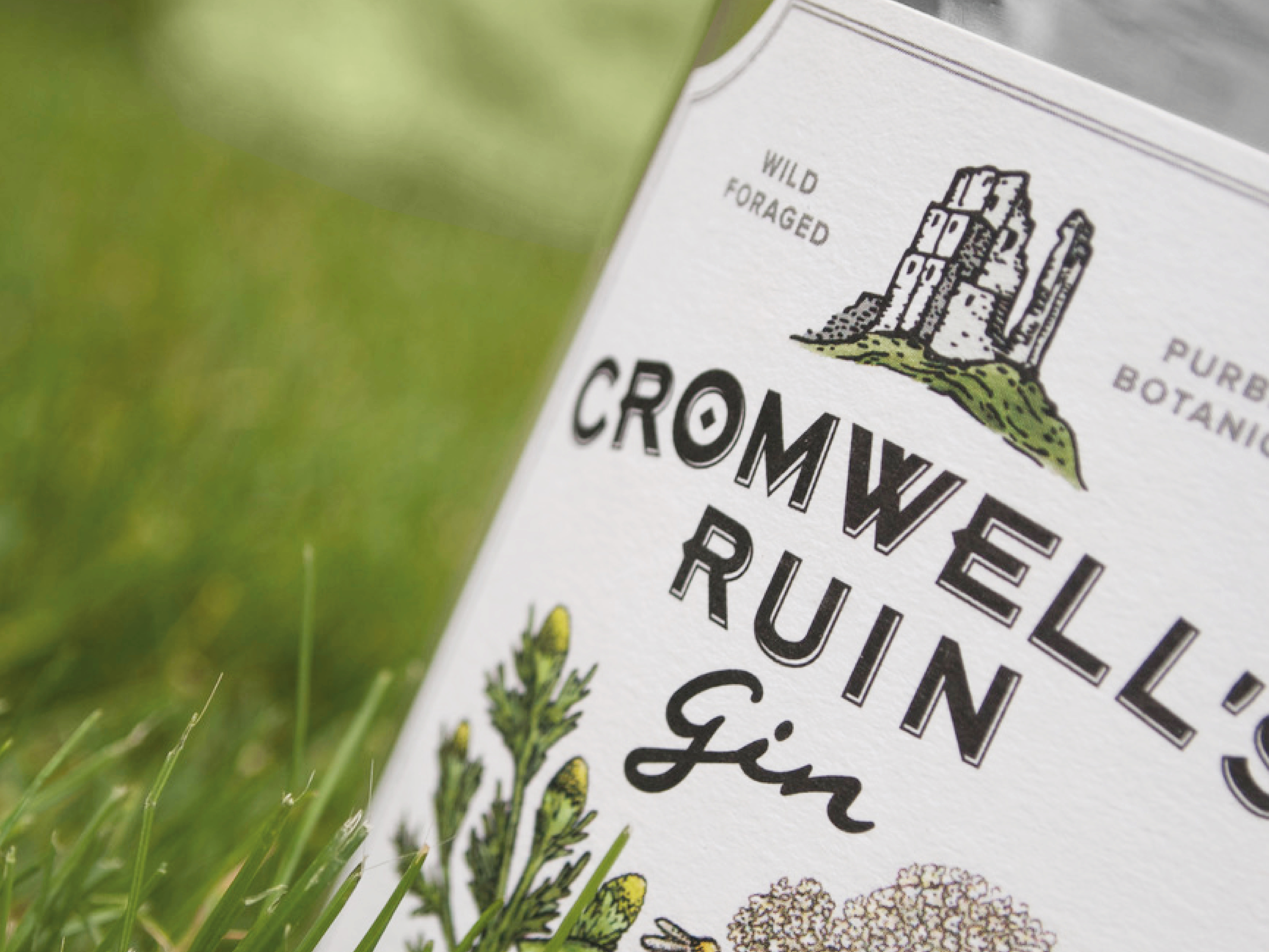 Cromwell’s Ruin. An organic, handcrafted gin blended with fragrant pineappleweed and elderflower foraged across the Purbecks by local legend and artisan distiller Martin Jennings – Co-founder of Pothecary Gin. This small batch gin is a celebration of the long standing history of Corfe Castle and is sold exclusively in the village of Corfe. With bespoke period-authentic typography and hand rendered illustrations this product really is a home grown hero.